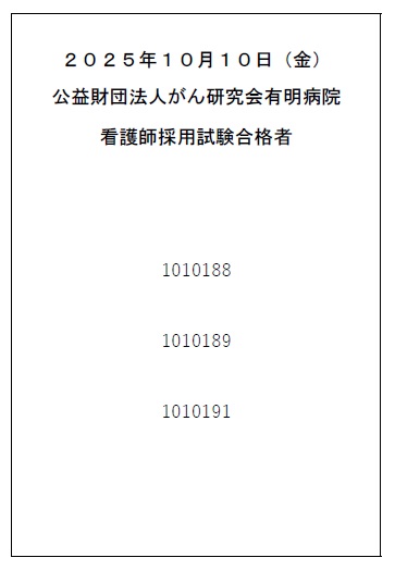 2025年10月10日(金)がん研究会有明病院 看護師採用試験の合格者を発表いたします。