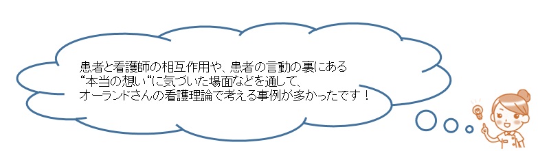 ・日々の看護実践で行っていることは、まさに看護理論だと理解できた。 事例を共有してみると1つの理論だけに当てはまるのではなく、見い出した意味には共通する理論もあると思った。いろいろな看護理論にあてはめながら思考を組み立てていく事も重要だと思った。