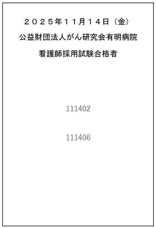 2025年11月14日(金)がん研究会有明病院 看護師採用試験の合格者を発表いたします。